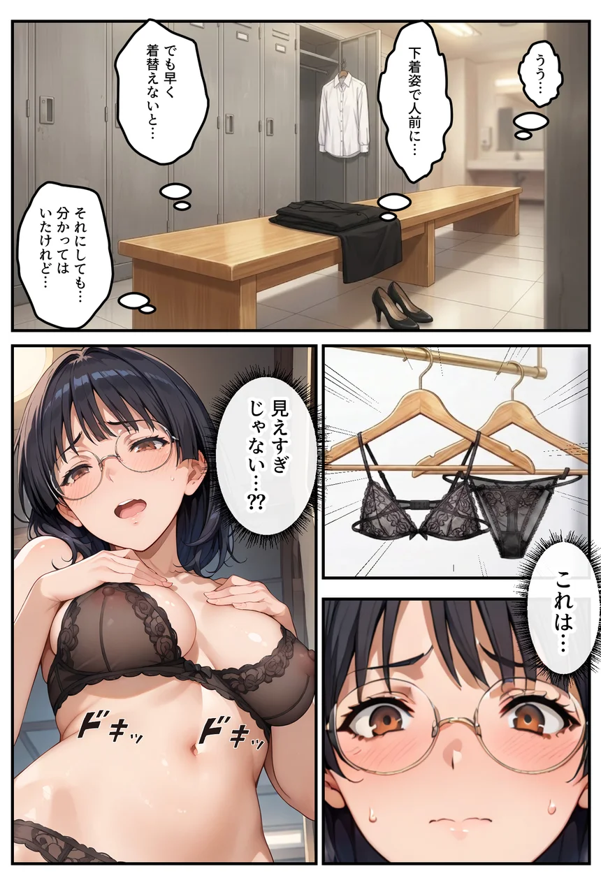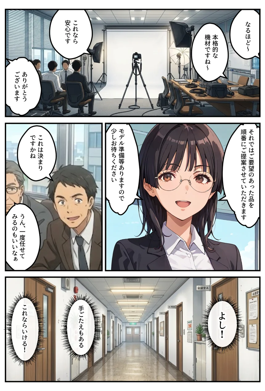 プレゼンが進むにつれて下着はどんどきわどくなり、触られ・引っ張られ・見られるうちに身体は正直に反応しはじめてしまう。バイブ挿入、愛撫、そして最終的には大乱交と、羞恥と快楽が限界を超えたとき、彼女は自ら腰を振りはじめてしまう。極めつけは、自分を目標にしてくれていた後輩くんにその姿を目撃されてしまうという、羞恥ポイント最高潮の展開。中出し状態でのカタログ撮影や、愛液・精子まみれでのお見送りまで描かれる濃密な内容は、辱め・羞恥・快楽堕ちが好きなら絶対に見逃せない一作だ。